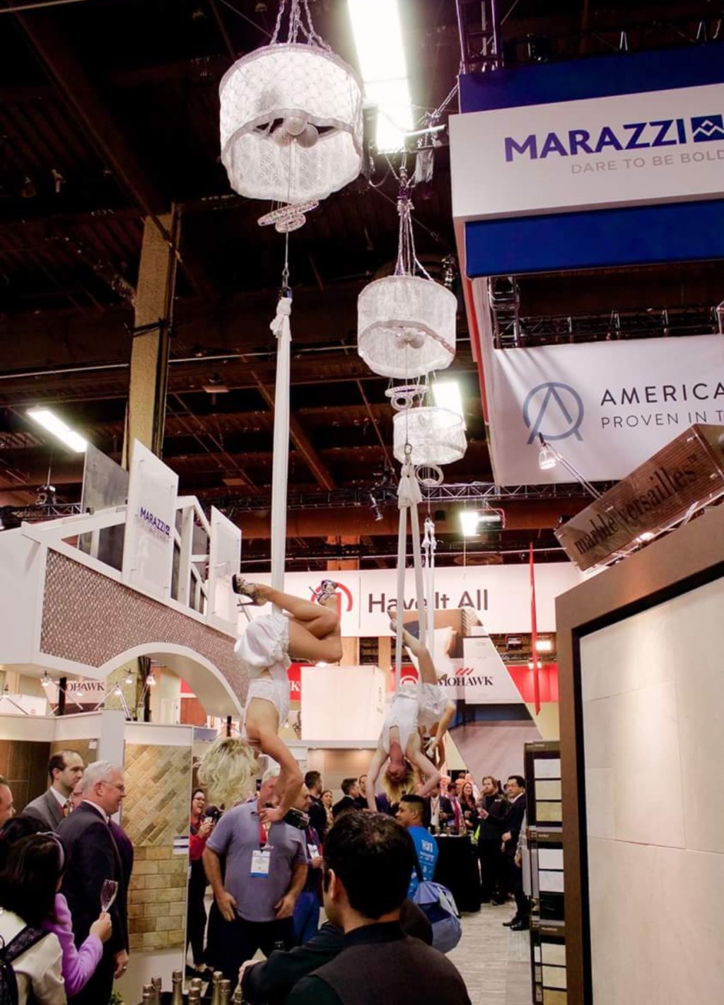 The Mohawk and Daltile team Warm Your Floor getting bubbly at #TISE2016 with the aerial bartender serves, interacts with the exhibitors makes them feel involved in the spectacle! Aerial Bartenders are a unique and stunning entertainment concept for any event. Our beautiful breathtaking Aerial Bartenders imazed and entertained as aerial bartenders are raised and lowered on a motors as pours the drinks directly for the exhibitors, while literally hanging upside down and flipping and spinning through the air.