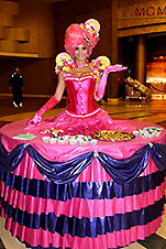 Greet your guests upon arrival with a gorgeous human strolling table serving glasses of champagne. Our beautiful stroling tables can hand out items place cards, name badges, candy, cigars, mardi gras beads, casino chips, celebrate look like programs and more. They will get the attention of anyone who passes by or since they are mobile, they can go to where the guests are.